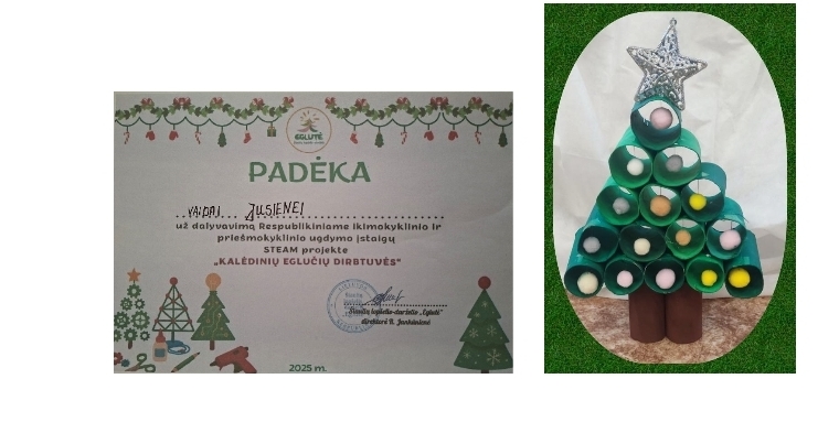 Respublikinio STEAM ,,Kalėdinių eglučių dirbtuvės‘‘ projekto veiklomis siekiama skatinti vaikų tiriamąją, praktinę ir kūrybinę veiklą, ugdyti savarankiškumą ir bendradarbiavimo gebėjimus bei plėtoti STEAM patirties sklaidą tarp ikimokyklinio ir priešmokyklinio ugdymo įstaigų. Projektas vyko 2025 m. gruodžio 1 d. iki gruodžio 19 d.