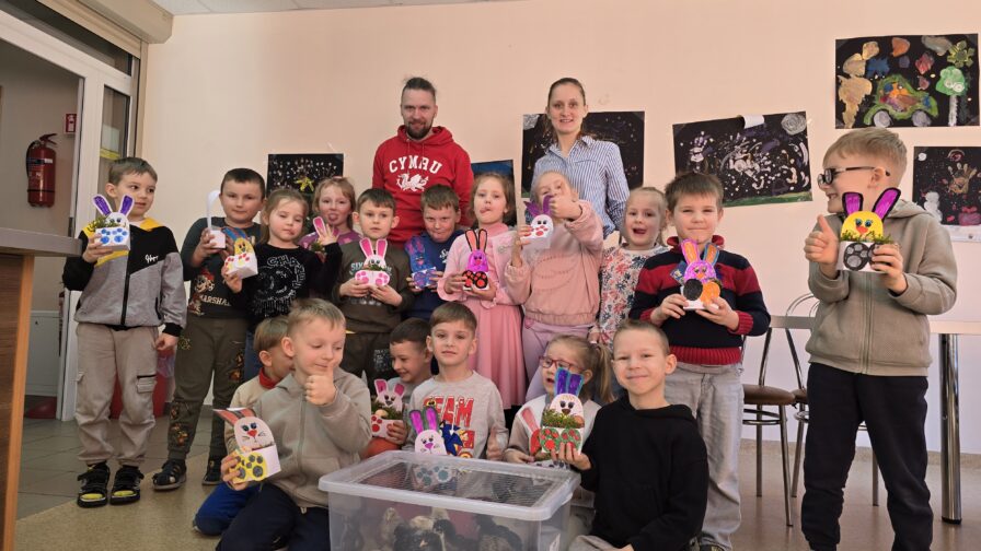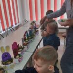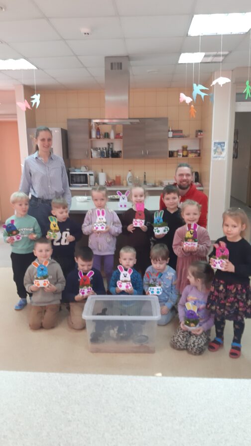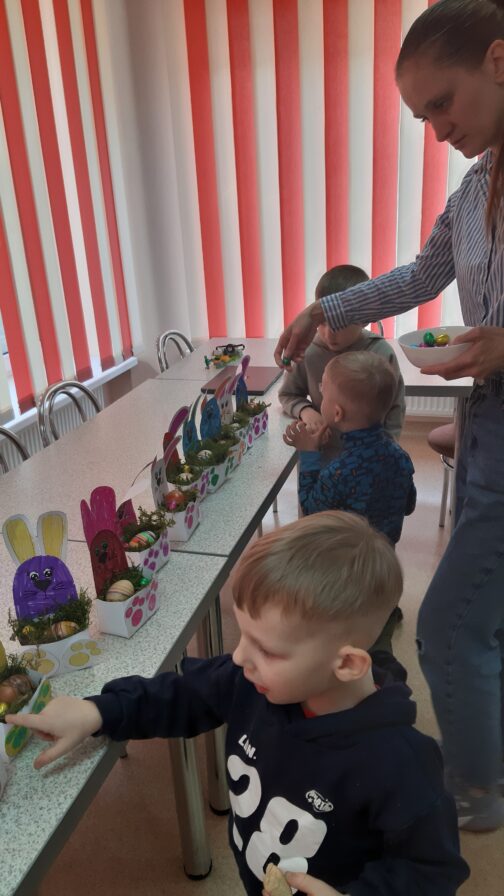 Artėjančių švenčių nuotaiką dar labiau sustiprino kūrybinės veiklos – vaikai margino kiaušinius, eksperimentavo su spalvomis ir raštais, o dirbtuvėse gamino kiaušinių dėžutes su zuikiu. Kiekvienas darbelis buvo unikalus ir kupinas vaikų fantazijos.
