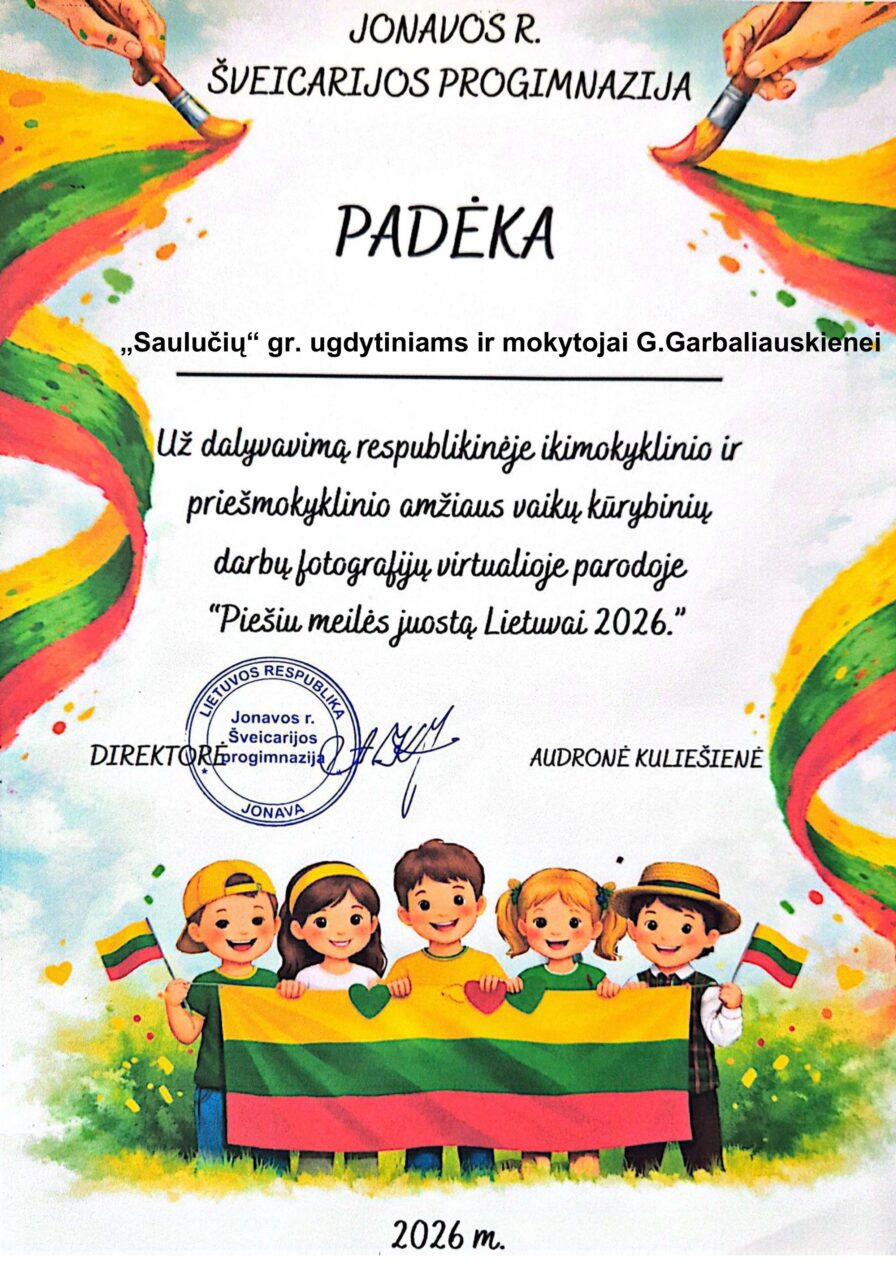 Dalyvavome respublikinėje ikimokyklinio ir priešmokyklinio amžiaus vaikų kūrybinių darbų fotografijų virtualioje parodoje „Piešiu meilės juostą Lietuvai 2026“. Šios parodos tikslas – ugdyti vaikų meninę raišką, kūrybinius gebėjimus, pilietiškumą, stiprinti tautinį ir kultūrinį tapatumą bei patriotinius jausmus Tėvynei, plečiant jų supratimą apie Lietuvą.