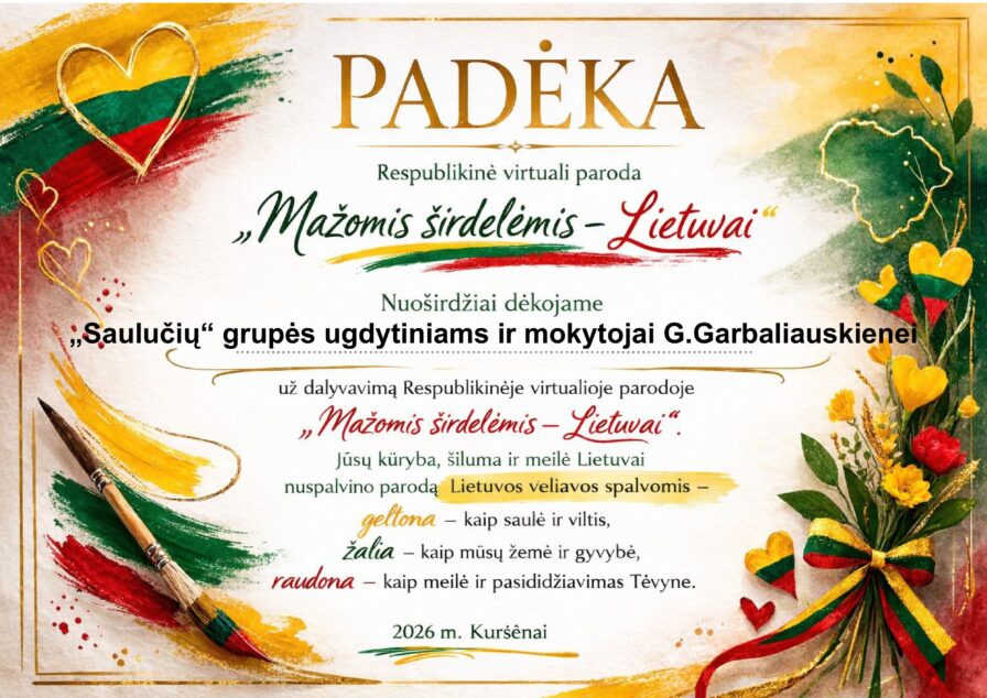 Taip pat prisijungėme prie respublikinės virtualios parodos „Mažomis širdelėmis – Lietuvai“. Parodos tikslas – skatinti 2–6 metų vaikų meilę Lietuvai, kūrybiškai ją išreiškiant darbeliuose su širdelės simboliu.
