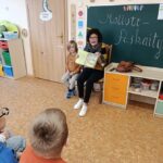 Paskutinę projekto dieną sulaukėme ypatingos viešnios – močiutės Reginos, buvusios darželio auklėtojos, kai kuriems vaikams jau pažįstamos. Palaikydami gražią draugystę pakvietėme ją prisidėti prie projekto, o vaikučiai su dideliu susidomėjimu klausėsi sekamos pasakos „Varna ir sūris“. Akys žibėjo, o emocijos liudijo, kad skaitymo patirtis buvo ypatinga.