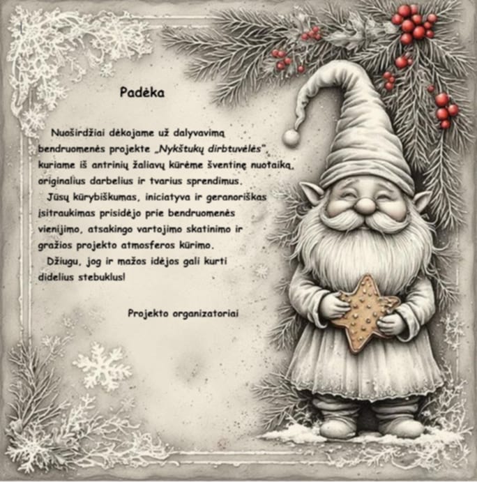 Gruodžio 5 dienos rytą „Saulučių“ grupę užliejo šiluma ir šventinis jaudulys – įžiebėme savo Kalėdų eglutę. Vaikai šios dienos laukė nekantriai, nes eglutę puošė pačiais brangiausiais papuošimais – kartu su tėveliais ir močiute dekoruotais Kalėdų žaisliukais. Kiekvienas jų buvo unikalus, turėjo savo istoriją, spalvą ir vaikų kurtą idėją. Šventinę nuotaiką kūrė ir vaikų atlikta dainelė „Nykštukas ledinukas“, rateliai „Eikš ir tu“ bei „Graži mūsų šeimynėlė“. Susirinkusieji klausėsi Advento burtų pasakos, kurią ypatingai šiltai ir jautriai skaitė Domo ir Motiejaus močiutė. Skambant muzikai ir vaikų balsams, suskaičiavome iki penkių, ir eglutė nušvito spalvotomis lemputėmis. Ši šviesa tapo simboline mūsų šventinio laikotarpio pradžia – priminimu apie gerumą, draugystę ir mažus stebuklus, kuriuos kuriame kartu.